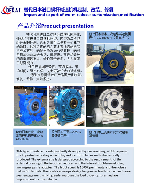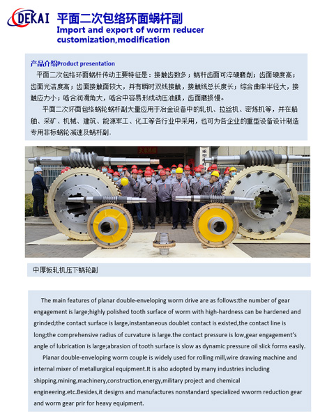本公司设计制造的A225、A250系列平面二次包络减速机,内部蜗轮蜗杆采用平面二次包络技术,其承载能力大,传动效率高,结构紧凑,使用寿命长,外形精美。适用于大型钢厂各种连铸机械。选用该减速器需要详细资料,请于德凯机械联系。